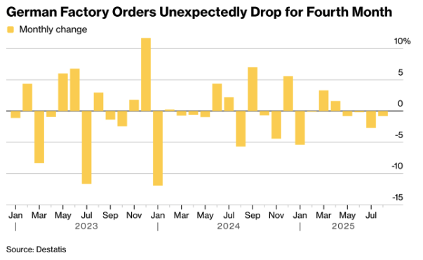 The country’s industrial sector remains under pressure. Factory orders dropped by 0.8% in August – the fourth consecutive monthly decline – defying expectations for an increase. Foreign demand weakened once more, while domestic orders rose slightly, partly due to one-off defense-related contracts.
