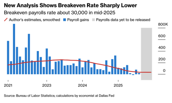 (chart: New Analysis Shows Breakeven Rate Sharply Lower – Breakeven Payrolls Rate About 30,000 in Mid-2025)