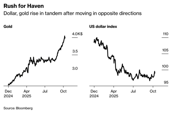 At the same time, capital flows shifted decisively toward safe havens. Gold surged 3% to above $4,000 per ounce, while the dollar also strengthened – a rare combination signaling broad risk aversion. The yield on 10-year Treasuries edged down slightly to 4.05%.