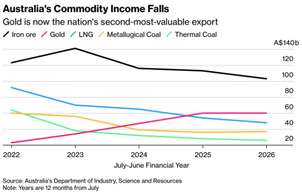 Australia’s economy is benefiting only partially from the global gold rally. According to the Ministry of Industry, gold – following its “extraordinary price surge” above $4,000 per ounce – is set to surpass LNG as the nation’s second-most-valuable export, just behind iron ore. However, this windfall only partly offsets falling revenues from other commodities.