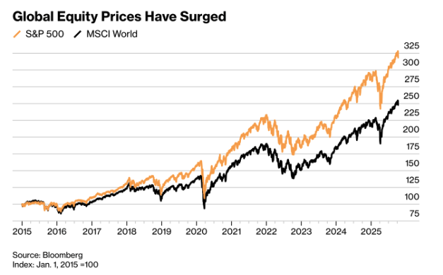 (chart: “Global Equity Prices Have Surged,” Source: Bloomberg – Index 2015 = 100)