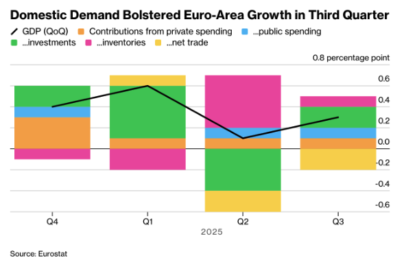 The chart on third quarter GDP growth shows that domestic demand is doing most of the heavy lifting. Growth came in at 0.3 percent quarter on quarter, higher than previously estimated. This strengthens the conviction within the Governing Council that the current level of interest rates remains appropriate for the time being.