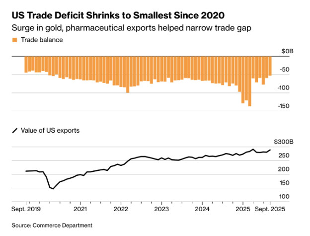 The US trade deficit narrowed sharply and unexpectedly in September to 52.8 billion dollars, the lowest level since 2020. The chart shows that the decline was driven by a strong increase in exports, while imports rose only modestly.