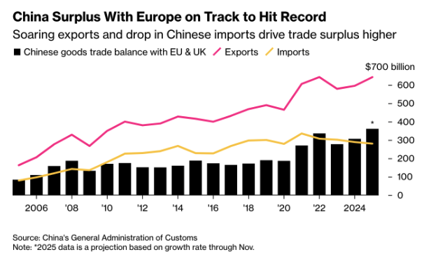 Tensions between China and Europe are rising rapidly as trade imbalances widen. The chart on China’s trade surplus with the EU shows it moving toward a record close to 300 billion dollars, as Chinese exports to Europe continue to increase while imports lag behind. Goods affected by US tariffs are increasingly being redirected toward the European market.