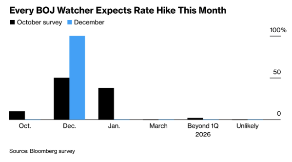 The chart on expectations around the BoJ decision shows that the market has positioned almost unanimously for a rate hike later this week. Policymakers have sent multiple signals over recent months to prepare investors for such a move.