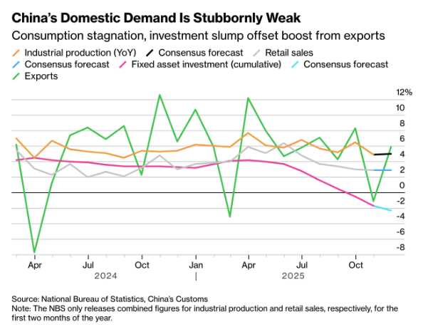 Retail sales and industrial production are likely growing at their slowest pace in at least a year. This keeps the recovery uneven and heavily dependent on external demand, increasing pressure on Beijing to step in on the domestic side of the economy.
