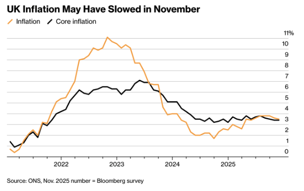 The chart on UK inflation suggests that price pressures likely eased further in November toward 3.4 percent, the lowest level in six months. While this remains clearly above the 2 percent target, it confirms the downward trend. Wage data and inflation figures ahead of the decision will therefore be crucial in balancing cooling growth against still elevated price pressures.