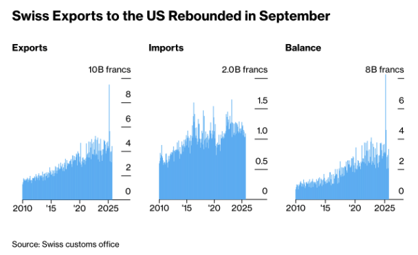 In return, Swiss and Liechtenstein firms committed to invest roughly $200 billion in US manufacturing and R&D over the next five years, including in pharmaceuticals and machinery. The deal places Switzerland on equal footing with the EU, although the strong franc remains a competitive headwind. (Chart: “Swiss Exports to the US Rebounded in September” – source: Swiss Customs Office)