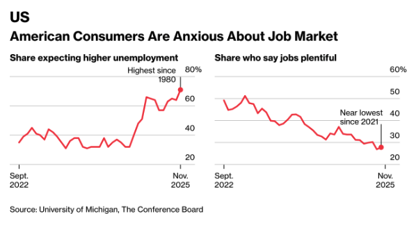 Consumer sentiment in the United States remains subdued as concerns about jobs and purchasing power rise again. Surveys from the University of Michigan and The Conference Board show that Americans remain negative about the economic outlook and President Trump’s policies. The Republican electoral loss underlines how the high cost of living and a cooling labour market weigh heavily on public confidence. (Chart: “American Consumers Are Anxious About Job Market” sourced from the University of Michigan and The Conference Board)