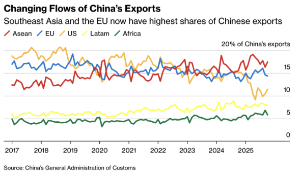International trade continues to face pressure. US import volumes are moving lower toward the end of the year due to persistent tariff uncertainty and weaker consumption. China is redirecting a growing share of its exports toward Southeast Asia and the EU, which have now become its largest markets. This points to structural geopolitical shifts rather than temporary disruption. (Chart: “Changing Flows of China’s Exports” sourced from China’s General Administration of Customs)