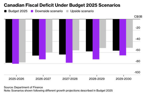 The minutes show that the cut was justified by ongoing labour market weakness, low growth and inflation near 2 percent. Policymakers also stressed that protectionist measures from the United States continue to damage sectors such as steel, timber and the automotive industry. (Chart: “Canadian Fiscal Deficit Under Budget 2025 Scenarios” sourced from the Department of Finance)