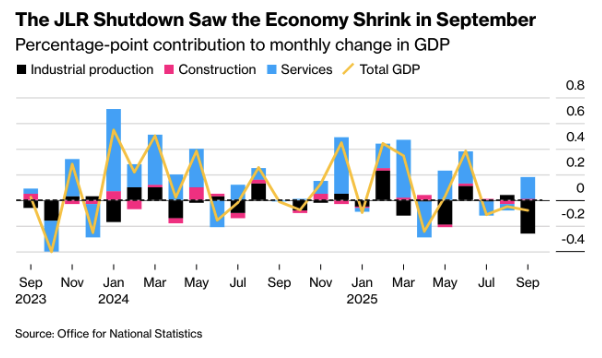 The British economy stalled in the third quarter with GDP growth of only 0,1 percent compared with 0,3 percent in the second quarter. The setback was largely the result of the cyberattack on Jaguar Land Rover, which caused motor vehicle production to drop by almost thirty percent in September, the steepest decline since the pandemic. Total industrial production fell by 2 percent and the services sector grew slightly by 0,2 percent. (Chart: “The JLR Shutdown Saw the Economy Shrink in September” sourced from the ONS)