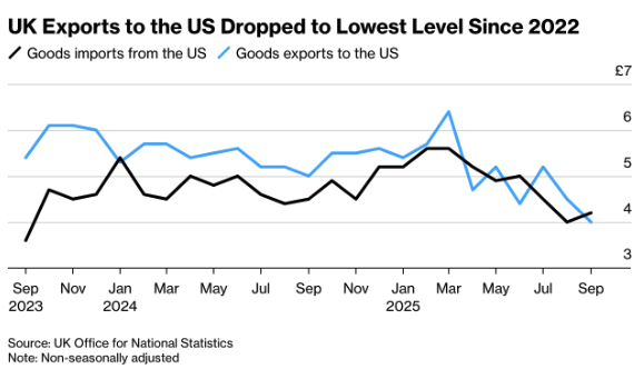 British exports to the United States fell by 11,4 percent to the lowest level since early 2022, partly due to the trade tariffs imposed by the Trump administration. (Chart: “UK Exports to the US Dropped to Lowest Level Since 2022” sourced from the ONS)