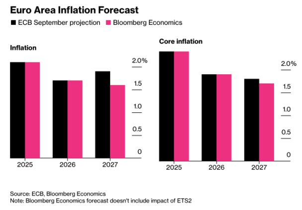 The delay of the new European emissions trading system known as ETS2 introduces a new risk for the eurozone inflation outlook. Without the mechanism, which from 2027 would add extra costs to fuels and transport, inflation risks drifting below the 2 percent target again. (Chart: “Euro Area Inflation Forecast” sourced from the ECB and Bloomberg Economics)