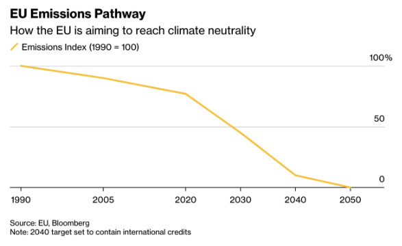 The European Central Bank had already outlined a subdued outlook in its latest projections with inflation expectations of 1,7 percent in 2026 and 1,9 percent in 2027. The delay of ETS2 could push these expectations even lower, especially since its price effects would now appear later, possibly in 2028. Analysts at Danske Bank and JPMorgan note that this increases the likelihood of another round of rate cuts in early 2026, particularly if growth weakens or inflation expectations drift further down. (Chart: “EU Emissions Pathway” sourced from the EU and Bloomberg)