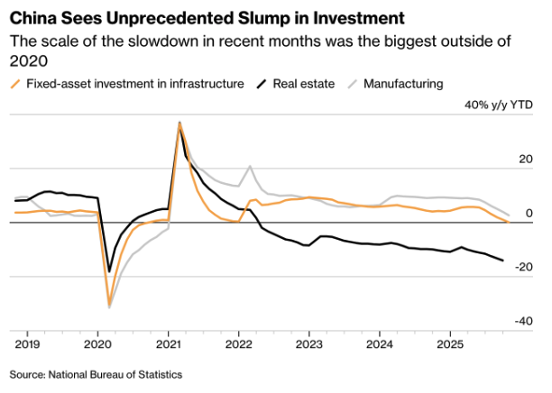 The Chinese economy is showing a troubling split. Consumer prices are edging higher, while investment activity is collapsing. Total investment fell by more than 11 percent year on year in October, the steepest drop since the first months of the pandemic in 2020. The decline hits a segment that represents almost half of China’s GDP and reinforces concerns about a broader slowdown in growth. (Chart: “China Sees Unprecedented Slump in Investment” sourced from the National Bureau of Statistics)