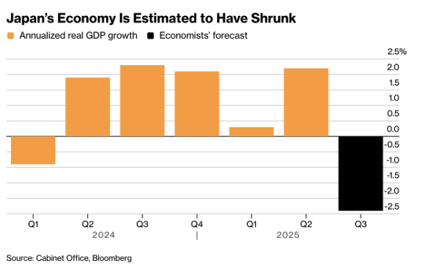 The Asian week begins with disappointing news. Japanese GDP figures are expected to show an annualised contraction of 2,4 percent in the third quarter, the first since early 2024. This gives Prime Minister Sanae Takaichi political room to prepare a substantial stimulus package later this month. (Chart: “Japan’s Economy Is Estimated to Have Shrunk” sourced from the Cabinet Office and Bloomberg)