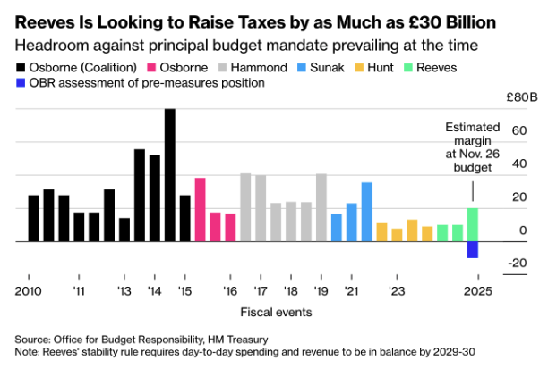 The stagnation coincides with growing uncertainty surrounding the budget of Labour minister Rachel Reeves. The prospect of higher taxes and weakening consumer confidence is prompting firms to delay investment, while unemployment has risen to its highest level since the pandemic. (Chart: “Reeves’ Budget Tax Raid Has Weighed on Growth This Year” sourced from the ONS)