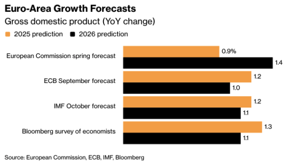 The outlook for the eurozone remains subdued. The slowdown in 2025 appears less severe than feared, although the recovery projected for 2026 already shows signs of weakening. The European Commission is likely to revise its earlier forecast of 0,9 percent GDP growth slightly upward, while the expectations for next year move closer to the 1 percent that the ECB already projected in September. (Chart: “Euro Area Growth Forecasts” sourced from the European Commission, ECB, IMF and Bloomberg)