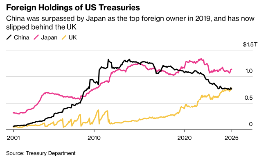 But China’s approach goes beyond diplomacy. A deeper shift is underway in global capital markets. According to the latest data from the U.S. Treasury Department, China sold $27.6 billion in long-term Treasuries in March. For the first time in over two decades, it has dropped to third place among foreign holders of U.S. debt, with $765 billion—just below the UK’s $779 billion. Japan remains the largest holder, with $1.13 trillion.