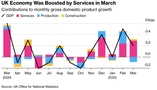 The UK economy grew by 0.7% in the first quarter—the strongest pace in a year and well above the Bank of England’s expectations. Much of the acceleration came from front-loaded production in February and March, as factories ramped up output to boost exports to the U.S. ahead of Trump’s looming tariff deadline. In March alone, GDP rose by 0.2%, defying earlier projections of stagnation. Growth was driven mainly by the services and construction sectors, while manufacturing contracted.