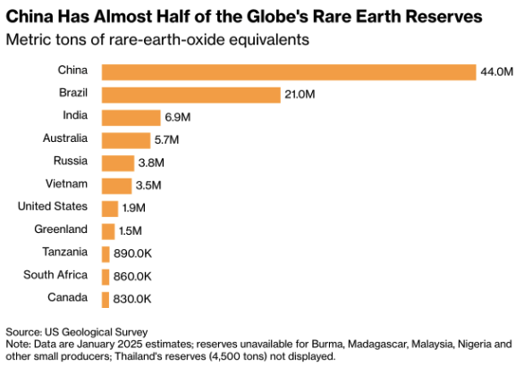 (Chart: “China Has Almost Half of the Globe’s Rare Earth Reserves” – Source: US Geological Survey, estimate as of January 2025)