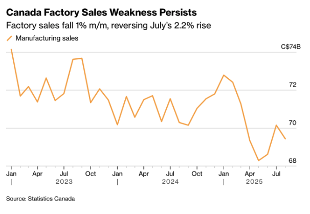 Canadian industrial activity weakened in August under the impact of US import tariffs. Factory sales fell by 1% m/m, while wholesale revenues declined by 1.2% – a smaller drop than feared but still a clear reversal after July’s 2.2% gain. The transport sector accounted for much of the weakness, with lower production of aerospace components and reduced vehicle and parts sales dragging the total down. The food and beverage industries also recorded declines. In real terms, factory sales decreased by 1.5% and wholesale sales by 1.3%.