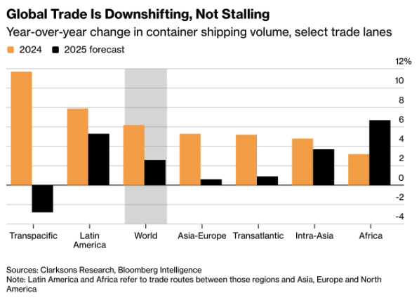 A shift is emerging in global trade patterns. Container flows between the US and Asia are set to shrink by nearly 3% this year – the steepest decline since the pandemic – while most other routes still show modest growth. The redirection of supply chains toward Latin America, Africa, and Southeast Asia points to a broader realignment of global trade under the strain of the highest US tariffs since the 1930s.