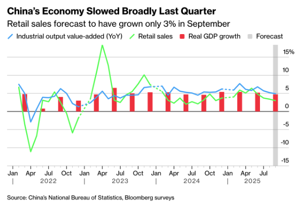 China’s economy likely grew 4.7% y/y in the third quarter – the slowest pace in a year. Exports remain strong, but domestic weakness in investment, industry, and consumption is weighing on momentum. Retail sales for September are expected to rise just 3% y/y, while industrial output climbs 5% – both the weakest readings of 2025.
