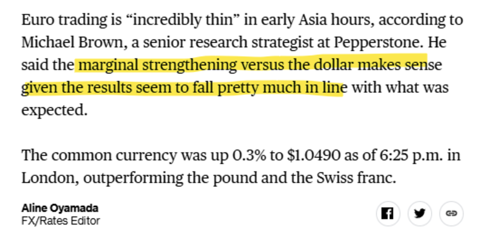 Euro trading was very quiet on Sunday night, as usual, with no significant movement following news that aligned with expectations.