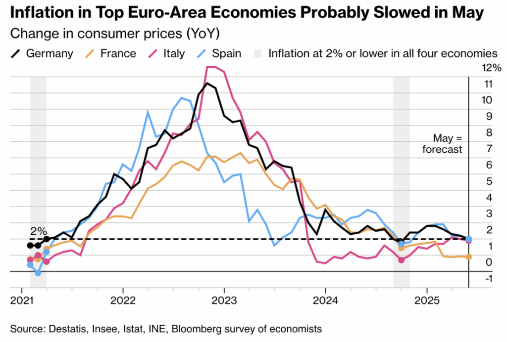 On Friday, preliminary German inflation data for May will be released—a crucial data point for the ECB’s policy path. A drop toward 2% would further justify upcoming rate cuts. Germany’s GfK consumer confidence index is also due Tuesday, where modest optimism is expected following recent stabilization in energy prices.