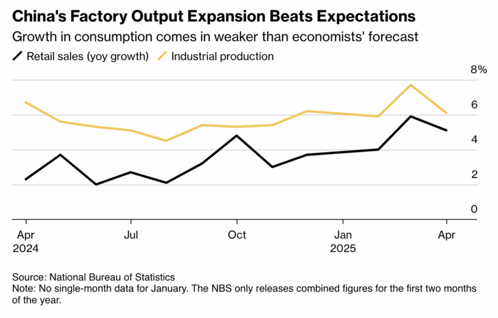 April’s data paints a mixed picture of China’s economy—showing resilience in industry but ongoing weakness in consumer demand. Industrial production rose by a stronger-than-expected 6.1% year-on-year, supported by a rebound in exports to Europe and Southeast Asia following the temporary easing of trade tensions with the U.S.