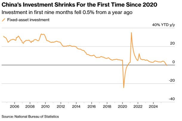 The Chinese economy grew by 4.8% year-on-year in the third quarter, slightly stronger than expected, thanks to exceptionally strong exports. Yet this growth conceals a deeper problem: domestic investment contracted for the first time since 2020, falling 0.5% in the first nine months of the year. The chart “China’s Investment Shrinks for the First Time Since 2020” (source: National Bureau of Statistics) underscores how the ongoing property crisis and weak private demand expose the structural vulnerabilities of the economy.