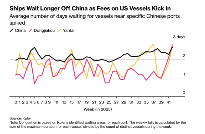 At the same time, trade is stalling amid rising tensions with the United States. New port surcharges on American vessels have led to the longest waiting times of the year at Chinese ports. The congestion reflects how geopolitical friction is once again disrupting global logistics and underscores that China’s growth still depends on external demand in an increasingly hostile trade environment.