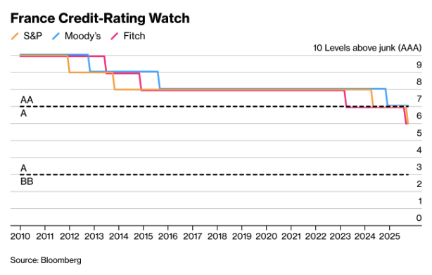 Moody’s downgraded France’s credit outlook from stable to negative, citing growing political fragmentation and the government’s inability to implement structural reforms. The move follows earlier downgrades by S&P, Fitch, and DBRS, underscoring mounting concerns over the country’s 5.4% of GDP budget deficit and rising debt ratio.