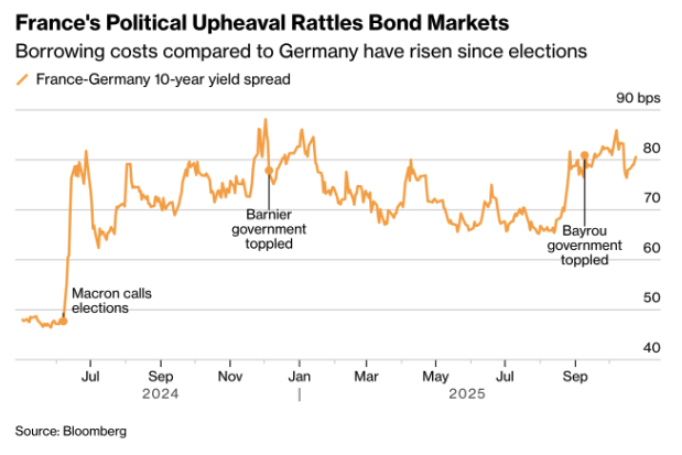 Prime Minister Sébastien Lecornu is attempting to reach a new budget compromise after suspending the pension reform, but divisions within parliament complicate any effort toward fiscal consolidation. French bond yields continued to rise, with the spread against Germany widening to 81 basis points – the highest level in nearly two weeks. Pressure on the government is increasing to reduce the deficit to a maximum of 4.8% by 2026, in line with calls from the Banque de France to stabilize the debt.