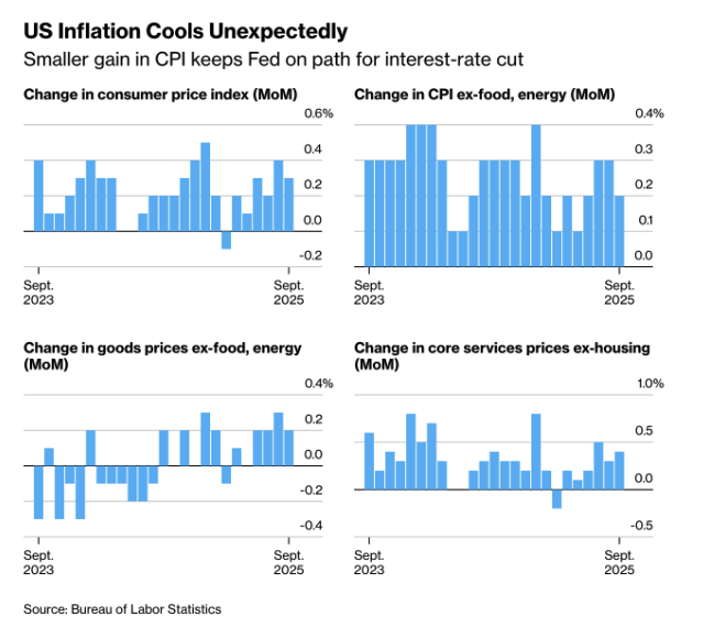 US inflation came in lower than expected in September, significantly raising the likelihood of another rate cut by the Federal Reserve. Core CPI rose only 0.2% month-on-month and 3.0% year-on-year, the smallest monthly increase in three months. Headline inflation also held at 3.0%, below the forecast of 3.1%. In particular, rent and other service costs weakened, with “owners’ equivalent rent” increasing by just 0.1%, the slowest pace since early 2021.