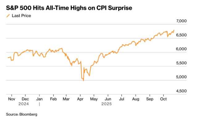 The S&P 500 rose nearly 1% and briefly broke through the 6,800-point mark after US inflation data came in lower than expected. The chart “S&P 500 Hits All-Time Highs on CPI Surprise” (source: Bloomberg) illustrates the market’s relief: weaker price pressures increase the likelihood of additional rate cuts by the Federal Reserve.