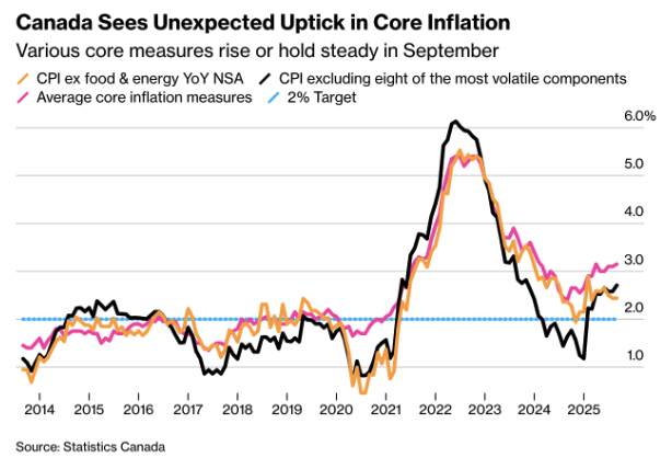 In Canada, easing is also expected. The Bank of Canada is projected to lower its policy rate to 2.25 percent, despite an unexpected uptick in core inflation. The chart “Canada Sees Unexpected Uptick in Core Inflation” (source: Statistics Canada) shows that the various core measures remained stable to slightly higher in September, averaging 3.15 percent. Still, the central bank sees enough room to support the slowing, tariff-hit economy. Upcoming GDP figures are likely to confirm that third-quarter growth remains weak.