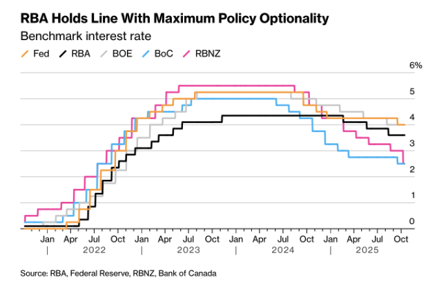 The chart “RBA Holds Line With Maximum Policy Optionality” (source: RBA, Federal Reserve, RBNZ, Bank of Canada) shows that the RBA is keeping its policy rate steady while deliberately maintaining maximum flexibility to tighten again if price pressures re-emerge. The upcoming inflation release will therefore be crucial in determining whether Australia has truly reached the end of its tightening cycle.